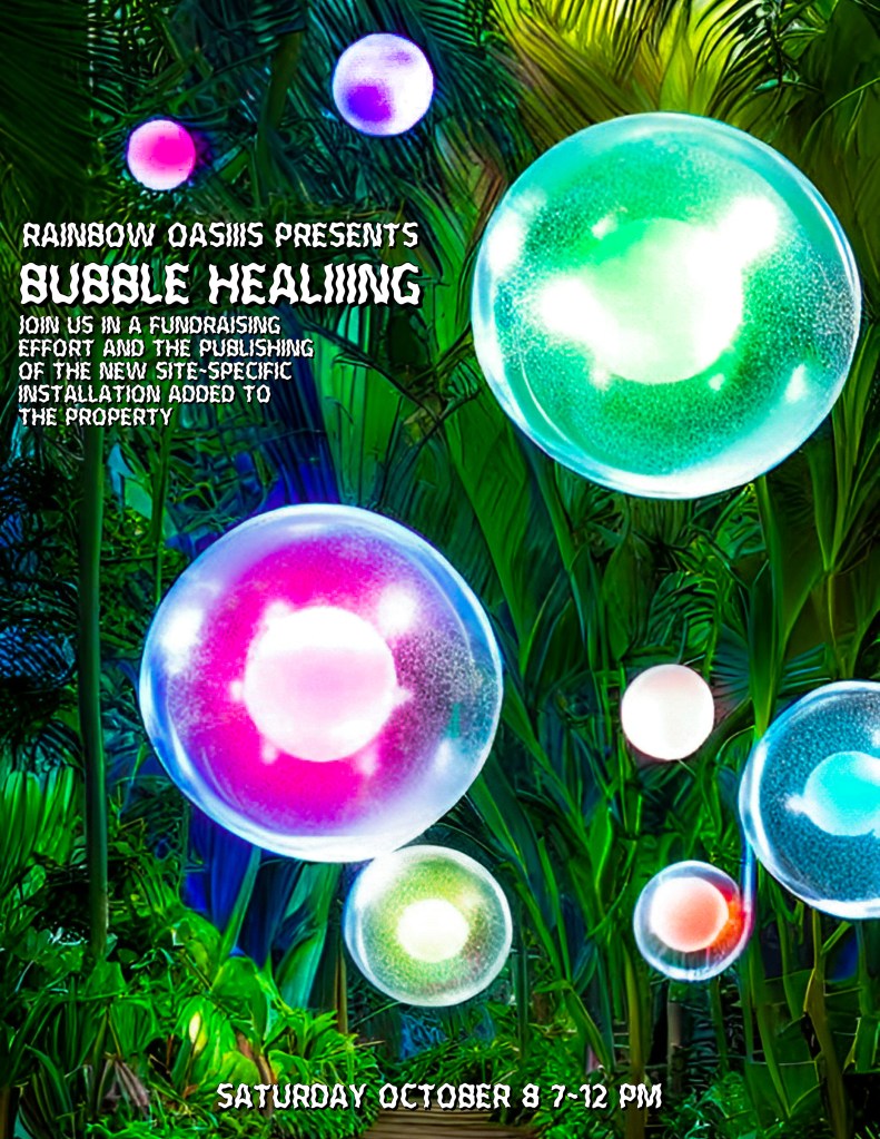 We invite you to join us for the first Rainbow Oasiiis fundraiser, Bubble Healiiing. This site-specific installation is the first permanent addition to our growing organization, and we are so excited to share it with you! We will be raising money for Rainbow Oasiiis and celebrating our efforts with a silent auction, food, drinks, and open dialogue about what’s next for us in our mission toward health equity. Due to space Limited tickets will be sold